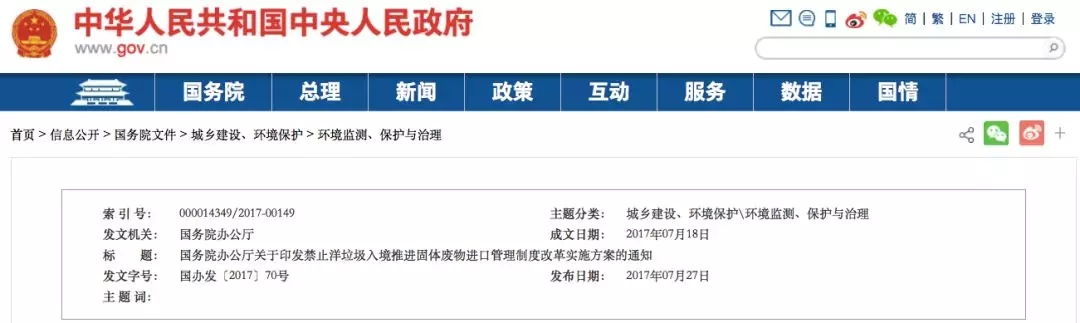 去年7月18日,國(guó)務(wù)院辦公廳發(fā)布《關(guān)于印發(fā)禁止洋垃圾入境 推進(jìn)固體廢物進(jìn)口管理制度改革實(shí)施方案的通知》,通知稱:
