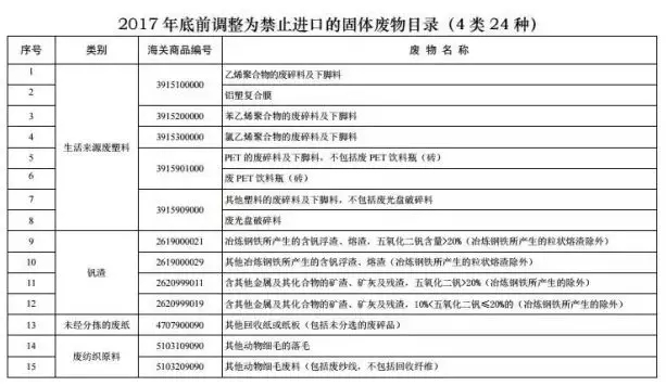 決定禁止進(jìn)口的“洋垃圾”有4大類共24種,分別是來(lái)自生活源的廢塑料(8種)、未經(jīng)分揀的廢紙(1種)、廢紡織品原料(11種)和釩渣(4種)。這一進(jìn)口禁令已經(jīng)從去年12月31日起執(zhí)行。