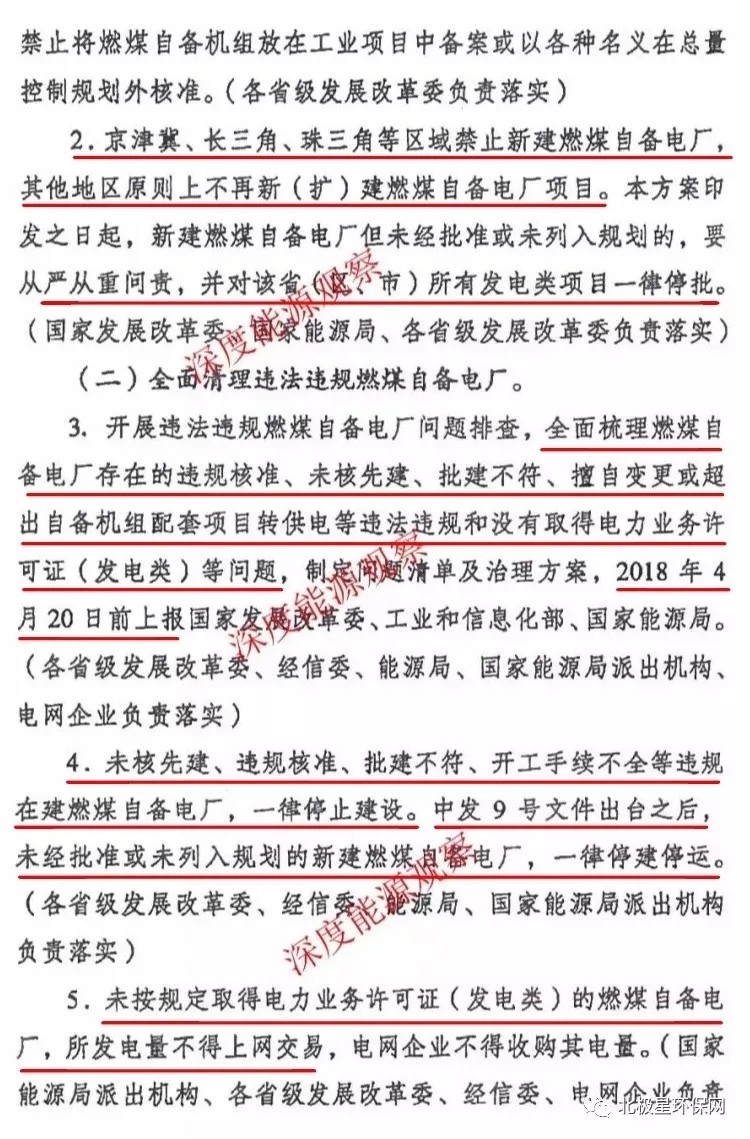 全面梳理燃煤自備電廠的違規(guī)準(zhǔn)備、批建不符等各類問題,4月20號前上報發(fā)改委、工信部、能源局。對于違規(guī)在建的燃煤燃煤自備電廠,一律停建!中發(fā)9號文之后,未經(jīng)批準(zhǔn)或未未列入規(guī)劃的新建燃煤自備電廠,一律停建、停運!