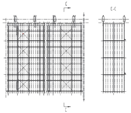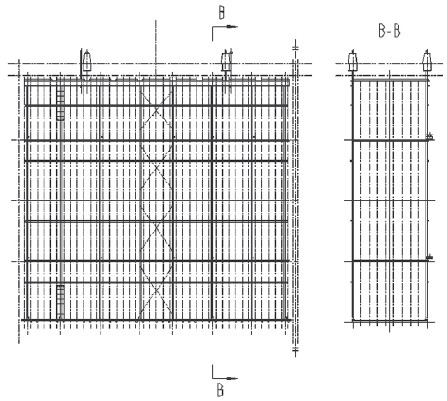 對(duì)圖1中的A一A剖視,電除塵器內(nèi)部第一電場(chǎng)的陰極系統(tǒng)如圖2所示,對(duì)其進(jìn)行小分區(qū)改造后如圖3所示。將原陰極系統(tǒng)框架中間位置割開(kāi),原一個(gè)陰極大框架被分為兩個(gè)小框架;移動(dòng)原陰極吊掛,并每個(gè)電場(chǎng)增加兩個(gè)陰極吊掛,使兩個(gè)陰極小框架獨(dú)立供電;割除原框架拉桿,在新的小框架中間各增加一排框架拉桿;在大框架割斷附近兩端,增加豎桿,以增大小框架兩端的強(qiáng)度。