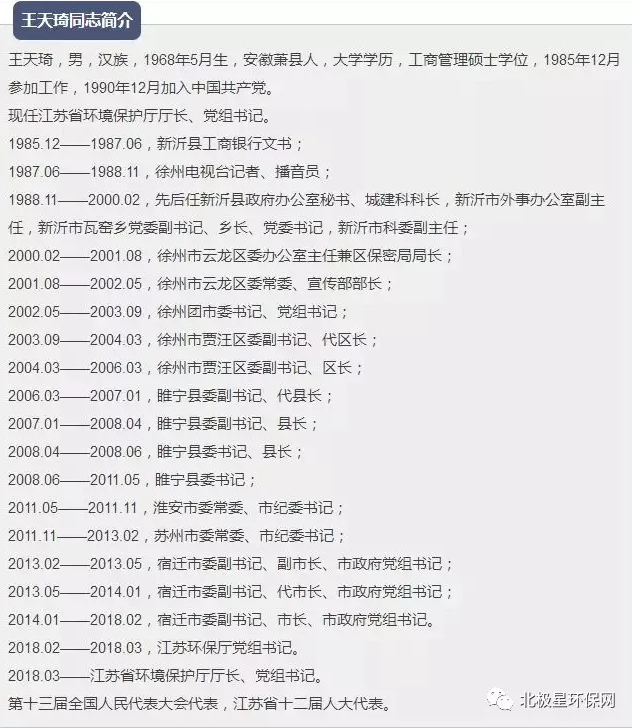 3月28日,江蘇省第十三屆人民代表大會(huì)常務(wù)委員會(huì)第二次會(huì)議通過,王天琦為江蘇省環(huán)境保護(hù)廳廳長(zhǎng)。