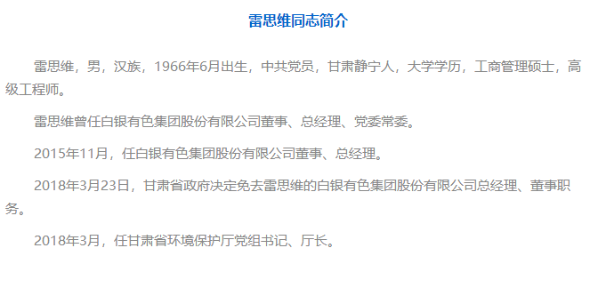 雷思維 任甘肅省環(huán)境保護(hù)廳廳長(zhǎng)
