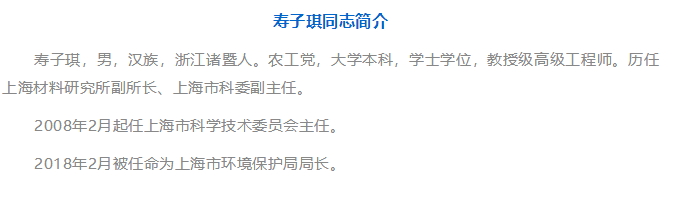 而上海市環(huán)保局局長(zhǎng)壽子琪,則是典型的專家型官員,他是教授級(jí)高級(jí)工程師,歷任上海材料研究所副所長(zhǎng)、上海市科學(xué)技術(shù)委員會(huì)副主任、上海市科學(xué)技術(shù)委員會(huì)主任。