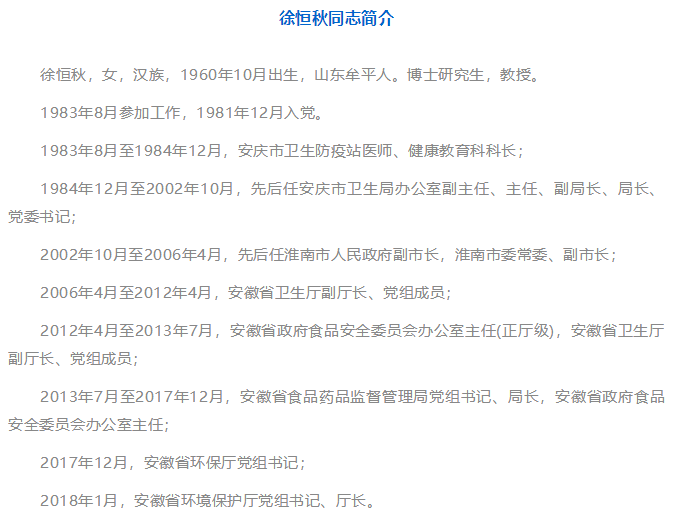 1月17日下午,安徽省第十二屆人民代表大會(huì)常務(wù)委員會(huì)第四十三次會(huì)議決定,任命徐恒秋為安徽省環(huán)境保護(hù)廳廳長(zhǎng)。