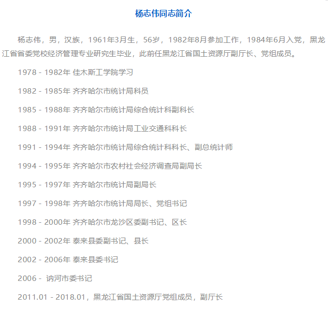 1月30日,黑龍江省第十三屆人民代表大會(huì)常務(wù)委員會(huì)第一次會(huì)議決定任命楊志偉為省環(huán)境保護(hù)廳廳長(zhǎng)。
