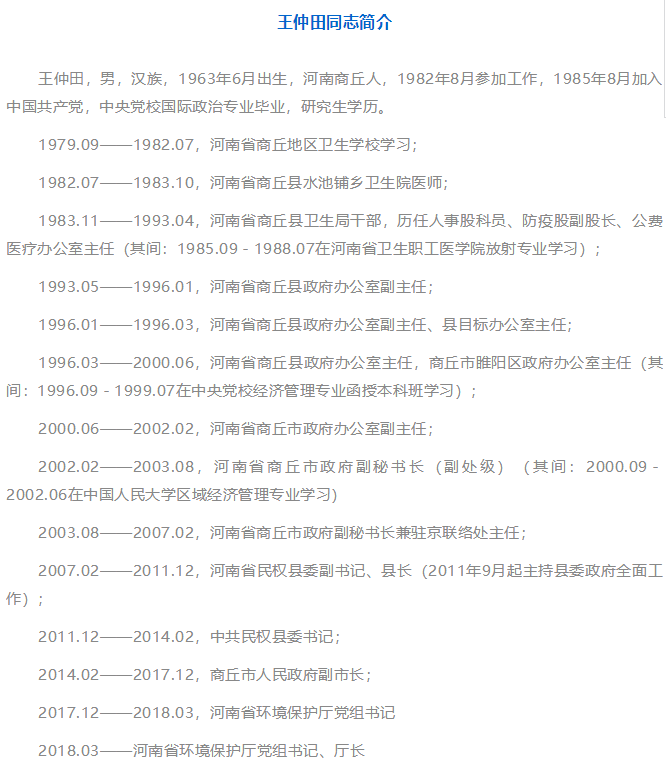 此外,還有一些來自地方黨委政府的新廳長(zhǎng),陜西省環(huán)保廳廳長(zhǎng)馮振東的上一個(gè)職務(wù)是陜西省延安市委副書記、政法委書記;2018 年3 月被任命的河南省環(huán)保廳廳長(zhǎng)王仲田,此前曾任河南省商丘市副市長(zhǎng)。