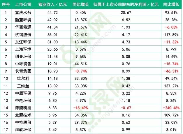 截止4月3日止共有17家環(huán)保上市公司發(fā)布2017年年報(bào)(其余將繼續(xù)跟進(jìn))。2017年?duì)I收排名靠前重慶水務(wù)、瀚藍(lán)環(huán)境、華西能源均在40億以上,營收僅津膜科技和長(zhǎng)青集團(tuán)同比下降。
