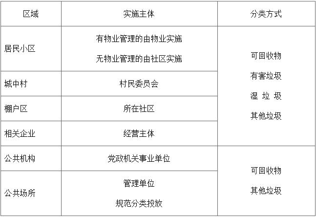 居民小區(qū):有物業(yè)管理的由物業(yè)單位配齊分類收集容器,沒有物業(yè)管理的由社區(qū)負責配齊。由社區(qū)向居民免費提供家用分類垃圾袋。新建小區(qū)必須配建分類收集點或垃圾房,新建大型小區(qū)必須配建生活垃圾分類中轉(zhuǎn)站。