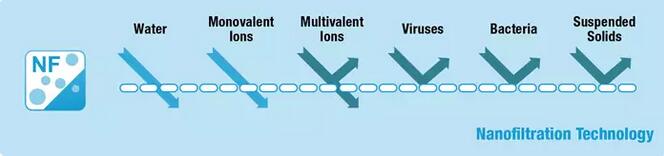 傳統(tǒng)的工業(yè)純水、瓶裝純凈水使用的大多是反滲透技術(shù),而納濾技術(shù)大家一般認(rèn)為它是介于超濾與反滲透之間的一種過(guò)濾技術(shù)。但因?yàn)樗谙到y(tǒng)設(shè)計(jì)、操作模式上跟反滲透接近,因此不少人會(huì)認(rèn)為它是一種“疏松”的反滲透。納濾是孔徑尺寸為0.001微米的選擇性膜過(guò)濾技術(shù),因?yàn)樗粌H能截留分子量較大的有機(jī)物以及多價(jià)離子,允許小分子有機(jī)物和單價(jià)離子透過(guò),并且能在高溫、酸、堿等苛刻條件下運(yùn)行,具有耐污染等優(yōu)點(diǎn),這些特性使其在實(shí)際運(yùn)行時(shí),所需壓力低、膜通量高、運(yùn)行費(fèi)用較低。