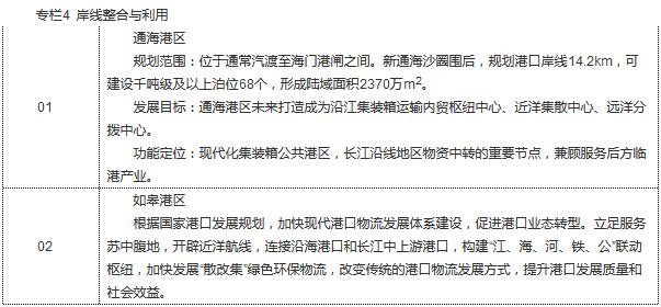 推進岸線整合與利用。提升開發(fā)利用區(qū)岸線使用效率,合理安排港口岸線、過江通道岸線、取排水口岸線。控制相關(guān)企業(yè)無序占用岸線,推進公共碼頭建設(shè)。港口工業(yè)生產(chǎn)岸線騰退轉(zhuǎn)移,生活、生態(tài)岸線空間穩(wěn)步增加,實現(xiàn)“三生”空間有序發(fā)展,統(tǒng)籌重要過江通道岸線的控制預(yù)留。加快沿江原南通港區(qū)、任港港區(qū)、狼山港區(qū)、富民港區(qū)以及江海港區(qū)的分期轉(zhuǎn)移和整合,形成沿江五港區(qū)的總體格局。嚴(yán)控新增港口岸線利用,取消或調(diào)整與水源保護、生態(tài)紅線區(qū)域等有沖突的港口碼頭。對一些開發(fā)布局不合理、未按國家有關(guān)規(guī)定、不符合規(guī)劃的開發(fā)利用項目逐步加以糾正。對涉及岸線利用的各類違法違規(guī)行為,重點清理整頓,逐步消除存量,堅決遏制增量。依法取締不具備安全生產(chǎn)條件、不符合環(huán)境保護要求的非法碼頭和裝卸點,到2020年,沿江非法碼頭徹底消除。建立健全長江岸線保護和開發(fā)利用協(xié)調(diào)機制,統(tǒng)籌岸線與后方土地的使用和管理。探索建立岸線資源有償使用制度。