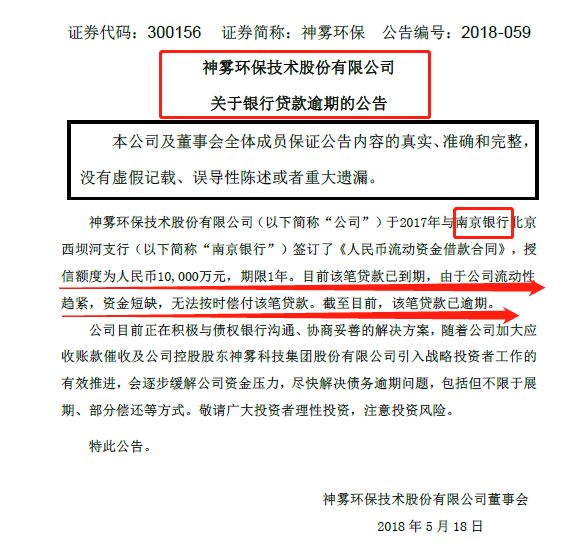 5月19日,神霧集團(tuán)公告稱,近日收到控股上市子公司神霧環(huán)保銀行貸款逾期事項。神霧環(huán)保南京銀行1億元貸款已到期,由于神霧環(huán)保流動性趨緊,資金短缺,無法按時償付該筆貸款,截至目前該筆貸款已逾期。