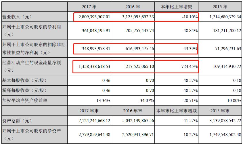 神霧環(huán)保2017年財報顯示,截止2017年末,神霧環(huán)??偁I收28.09億元,與上年同期相比減少10.10%,歸屬母公司的凈利潤3.61億元,與上年同期相比減少48.84%,經(jīng)營活動產(chǎn)生的現(xiàn)金流量凈額-13.58億元,與上年同期相比減少724.45% ,營收能力和盈利能力顯著下降,流動資金十分緊張。