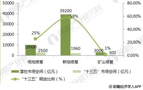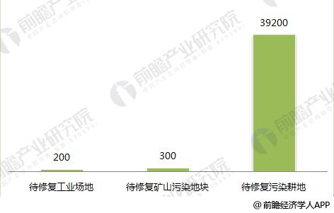前瞻產(chǎn)業(yè)研究院發(fā)布的《2018-2023年中國(guó)生態(tài)修復(fù)行業(yè)市場(chǎng)前瞻與投資戰(zhàn)略規(guī)劃分析報(bào)告》顯示,根據(jù)國(guó)家“到2020年現(xiàn)有位于城鎮(zhèn)內(nèi)人口密集區(qū)域的危化品生產(chǎn)企業(yè)全部啟動(dòng)搬遷改造”的指標(biāo),可以推測(cè)我國(guó)有待修復(fù)的工業(yè)場(chǎng)地存量200萬(wàn)畝,根據(jù)招投標(biāo)現(xiàn)狀來(lái)看,每塊地修復(fù)成本從百萬(wàn)至千萬(wàn)甚至上億不等,保守估計(jì)以每畝地20-50萬(wàn)元價(jià)格來(lái)估算,則場(chǎng)地修復(fù)市場(chǎng)空間將達(dá)到1萬(wàn)億元;我國(guó)的待修復(fù)礦山污染地塊在300萬(wàn)畝左右,保守估計(jì)以每畝地5-10萬(wàn)元左右價(jià)格垃圾進(jìn)行估算,則礦山修復(fù)市場(chǎng)空間將達(dá)到3000億元左右;待修復(fù)的污染耕地面積約為3.92億畝,每畝耕地修復(fù)價(jià)格以1萬(wàn)元為計(jì)算,則污染耕地修復(fù)市場(chǎng)空間為3.92萬(wàn)億??傆?jì)來(lái)看,這三類待修復(fù)土壤潛在市場(chǎng)空間達(dá)5.22萬(wàn)億元。