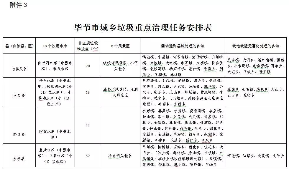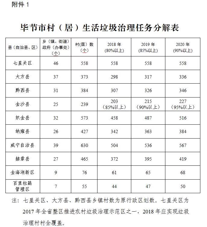(二)全域治理(2019年),全面開展城鄉(xiāng)垃圾治理攻堅行動。組建城鄉(xiāng)垃圾分類收運保潔隊伍,逐步探索垃圾分類收集保潔制度,實現(xiàn)城鄉(xiāng)環(huán)衛(wèi)保潔全覆蓋。全面推進城鄉(xiāng)生活垃圾“戶分類、村收集、鄉(xiāng)轉(zhuǎn)運、縣(中心鄉(xiāng)鎮(zhèn))處理”或“戶分類、村收集、中心鄉(xiāng)鎮(zhèn)處理”模式,開展城鄉(xiāng)垃圾清潔風(fēng)暴行動,全面清理城鄉(xiāng)垃圾。七星關(guān)區(qū)、金沙縣90%以上行政村垃圾得到有效治理,其他縣(自治縣、區(qū))85%以上行政村垃圾得到有效治理。