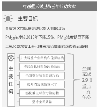 據(jù)了解,新《三年行動(dòng)方案》計(jì)劃用3年時(shí)間,通過調(diào)整產(chǎn)業(yè)結(jié)構(gòu)、優(yōu)化能源結(jié)構(gòu)、完善交通運(yùn)輸結(jié)構(gòu)、狠抓重污染天氣應(yīng)對(duì)等措施,全面完成29項(xiàng)重點(diǎn)工作任務(wù),讓全省的環(huán)境空氣質(zhì)量不斷改善。到2020年,全省設(shè)區(qū)市優(yōu)良天數(shù)比例達(dá)到80.3%,PM2.5濃度較2015年下降15%,PM10濃度明顯下降,重污染天數(shù)明顯減少,二氧化氮濃度上升和臭氧污染加重的趨勢得到遏制,二氧化硫、一氧化碳年均濃度基本達(dá)到國家環(huán)境空氣質(zhì)量二級(jí)標(biāo)準(zhǔn)。