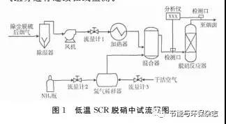 本低溫SCR脫硝中試的工藝流程如圖1所示,采用尾部布設(shè)低溫SCR工藝。流量計(jì)1控制進(jìn)入脫硝中試裝置的煙氣量,煙氣經(jīng)除濕器后由電加熱器加熱。氨氣來(lái)源于液氨鋼瓶,由流量計(jì)2控制進(jìn)入系統(tǒng)的氨氣量,以滿足中試設(shè)定的氨氮摩爾比。流量計(jì)3控制進(jìn)入氨氣稀釋器的空氣量,稀釋后的氨氣在混合器中與煙氣充分混合后進(jìn)入脫硝反應(yīng)器。低溫SCR催化劑裝填于脫硝反應(yīng)器中,反應(yīng)器內(nèi)徑0.3m,催化劑裝填高度約0.24m,催化劑層設(shè)有溫度探頭。中試采用德國(guó)SICK公司生產(chǎn)的S710多組分氣體分析儀對(duì)脫硝反應(yīng)器進(jìn)出口的煙氣組分進(jìn)行連續(xù)在線監(jiān)測(cè)。