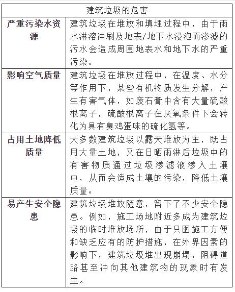 我國絕大部分建筑垃圾未經任何處理便被運往郊外露天堆放或填埋,既占用大量土地,又容易在清運和堆放過程中的遺撒粉塵、灰砂飛揚等問題,進而造成嚴重的環(huán)境污染。
