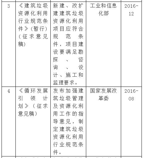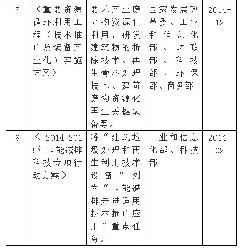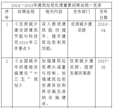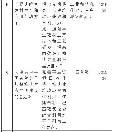 長期以來,由于缺乏統一完善的建筑垃圾管理辦法和良好的產業(yè)扶持政策致使建筑垃圾絕大部分未經任何處理便被露天堆放或簡易填埋,如何處理和利用建筑垃圾,已經成為政府所面臨的一個重要難題。為了解決建筑垃圾處理難題,促進建筑垃圾循環(huán)利用,國家近幾年頒布了一系列的政策法規(guī),具體政策如下: