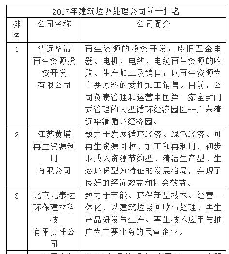 根據《中國報告大廳網》匯總信息得知,截至2017年底,通過對建筑垃圾處理行業(yè)各項數據統計,建筑垃圾處理公司排名前十的分別是清遠華清、江蘇黃埔、元泰達、天實偉創(chuàng)、上海山美、德濱環(huán)保、鼎盛工程、凱興礦山、一帆機械、黎明重工,詳細情況介紹如下: