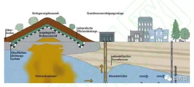 (2)隔離封閉,把污染物集中并用隔離膜封閉(Sicherungsmassnahmen)。當(dāng)污染物污染比較嚴(yán)重,分布范圍大、深,且對地下水也已經(jīng)造成污染,這種情況下,對污染源進(jìn)行清挖、換土費用太高,一般選擇就地隔離封閉處理,阻止污染物進(jìn)一步向外擴(kuò)散。具體做法是:把場地的污染土壤集中在一起,堆成山丘,鋪上隔離層(一種很厚的塑料膜,使用壽命100余年),以免繼續(xù)污染地下水或者空氣。在隔離層之上鋪大約2米厚的可供植物生長的新土層,進(jìn)行景觀再造,改造成為休閑場所,如圖2所示。