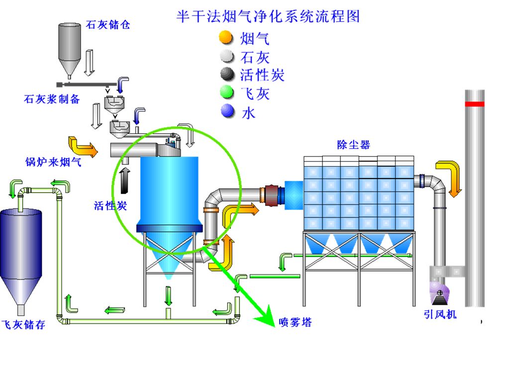 采用德國(guó)馬丁半干法煙氣凈化技術(shù),即“半干法噴霧塔+活性炭吸附+布袋除塵器” 工藝。
