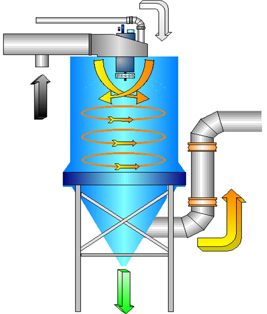 鍋爐出口溫度為210℃的煙氣自頂部導(dǎo)入噴霧塔,噴霧塔頂部導(dǎo)流片使煙氣進(jìn)入噴霧塔后形成旋轉(zhuǎn)紊流流動(dòng),噴霧塔的頂部布置石灰漿液噴霧機(jī),將石灰漿液粉碎成直徑為50微米以下的霧滴,以大大提高石灰漿液的比表面積和增加煙氣中酸性氣體分子與石灰漿液中氫氧化鈣分子接觸的面積和接觸的時(shí)間,以確保較高的反應(yīng)效率,酸性氣體與石灰漿液的反應(yīng)后生成粉塵顆粒,當(dāng)煙氣從噴霧塔導(dǎo)出時(shí)隨著流向的改變,在離心力的作用下,有較多的粉塵脫離煙氣掉入灰斗。