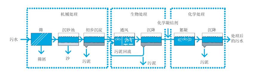 在20世紀(jì)60年代至70年代,瑞典修建了更多現(xiàn)代化的污水處理廠之后,極大地減少了磷和有機(jī)物的排放量。近十年來(lái),磷和生化需氧量的處理水平保持在95%左右。另一方面,自2010年起,瑞典的平均氮凈化水平一直維持在60%左右(瑞典環(huán)保署,2014)。從20世紀(jì)80年代中期開(kāi)始,增加了一些新的凈化方法,確實(shí)大幅提高了較大污水處理廠向氮敏感受體排放的氮的凈化水平。污水處理廠的處理過(guò)程如圖。