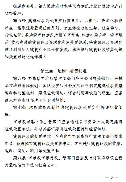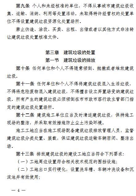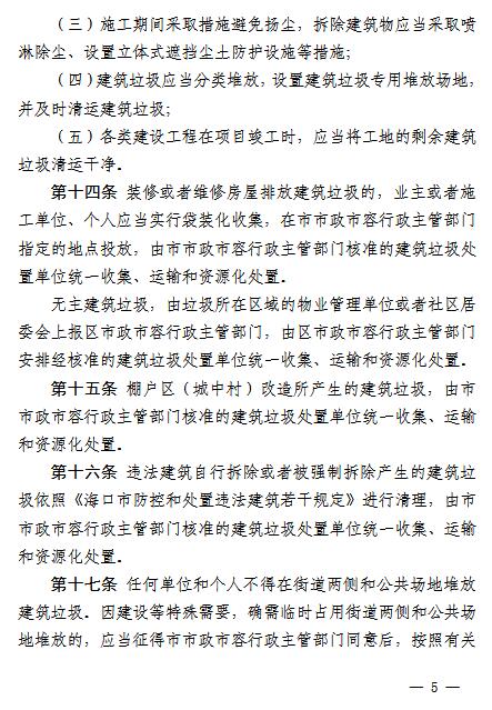 《辦法》要求,在建筑垃圾的排放上,任何單位和個(gè)人不得隨意傾倒、拋撒或者堆放建筑垃圾,不得將建筑垃圾混入生活垃圾,不得將危險(xiǎn)廢物混入建筑垃圾,不得擅自設(shè)立棄置場(chǎng)受納建筑垃圾。因建設(shè)等特殊需要,確需臨時(shí)占用街道兩側(cè)和公共場(chǎng)地堆放的,應(yīng)當(dāng)征得??谑惺姓腥菪姓鞴懿块T(mén)同意后,按照有關(guān)規(guī)定辦理審批手續(xù)。裝修或者維修房屋排放建筑垃圾的,應(yīng)當(dāng)實(shí)行袋裝化收集;無(wú)主建筑垃圾,由垃圾所在區(qū)域的物業(yè)管理單位或者社區(qū)居委會(huì)上報(bào)各區(qū)市政市容行政主管部門(mén);棚戶(hù)區(qū)(城中村)改造所產(chǎn)生的建筑垃圾,由??谑姓腥菪姓鞴懿块T(mén)核準(zhǔn)的建筑垃圾處置單位統(tǒng)一收集、運(yùn)輸和資源化處置。