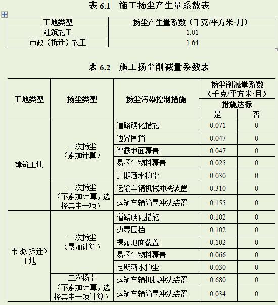 施工揚(yáng)塵產(chǎn)生量系數(shù)見表6.1,施工揚(yáng)塵削減量系數(shù)見表6.2。