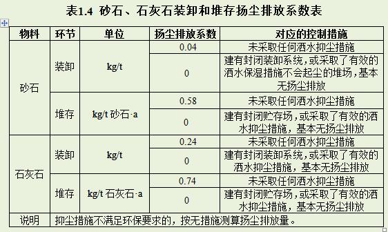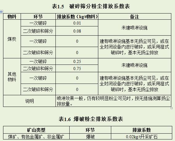 在粉塵無組織排放量計(jì)算時(shí),應(yīng)優(yōu)先采用公式法,所用公式參考《揚(yáng)塵源顆粒物排放清單編制技術(shù)指南》(環(huán)境保護(hù)部公告2014年第92號(hào));在公式法計(jì)算所需參數(shù)無法獲取時(shí),可采用排污系數(shù)法,具體的排放系數(shù)見表1.1~表1.6。