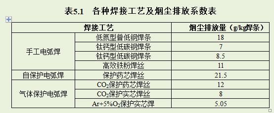 金屬家具焊接廢氣中主要污染物為煙塵。無除塵設(shè)施的,對(duì)應(yīng)于各種焊接工藝的煙塵排放系數(shù)見表5.1。有除塵設(shè)施的,焊接煙塵排放量應(yīng)采用實(shí)測(cè)監(jiān)測(cè)數(shù)據(jù)測(cè)算。