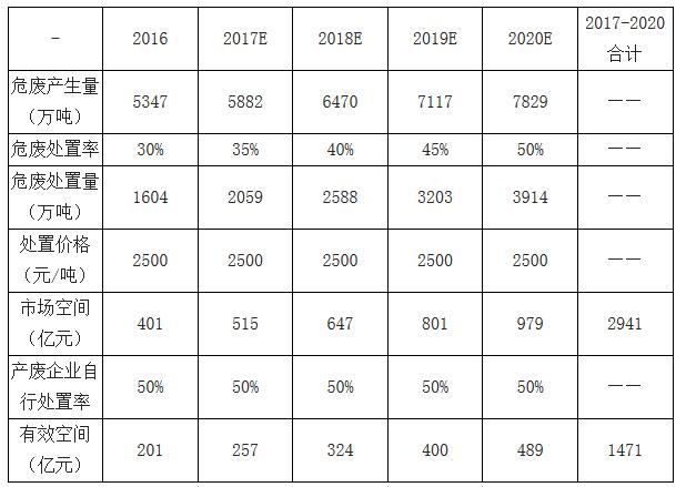我國危廢行業(yè)市場前景廣闊,市場空間充足。假設(shè)2017-2020年我國危廢產(chǎn)生量年均增長率10%(近6年CAGR9.3%),處理價格按2500元/噸,那么預(yù)計2020年危廢處理市場為979億元,2017-2020年處理空間約在3000億元左右,若產(chǎn)廢企業(yè)自行處置率按50%測算,有效市場空間約1500億元。值得注意的是,我國還有大量的危廢沒有納入統(tǒng)計口徑內(nèi),若按此前估算的1.05億噸作為2016年的基數(shù),預(yù)計2017-2020年處理空間約在6000億元左右,有效市場空間約3000億,廣闊前景值得期待。