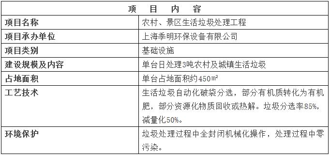 上海季明環(huán)保設(shè)備有限公司依據(jù)目前農(nóng)村垃圾分類不徹底,政府投入大,中端混合運(yùn)輸,末端混合處理等弊端,研究發(fā)明了多項(xiàng)適合中國農(nóng)村的生活垃圾處理技術(shù)與設(shè)備。其發(fā)明了一種農(nóng)村生活垃圾分選發(fā)酵技術(shù)+小型熱解氣化技術(shù),該技術(shù)無人工化、自動化分選,將農(nóng)村有機(jī)質(zhì)垃圾制有機(jī)肥,其他垃圾熱解氣化或資源利用。該技術(shù)專門用于我國農(nóng)村生活垃圾處置、城鎮(zhèn)生活垃圾處置、景區(qū)生活垃圾處置,其優(yōu)勢為無人化、自動化、占地面積小、無污染、減量化、資源利用化。
