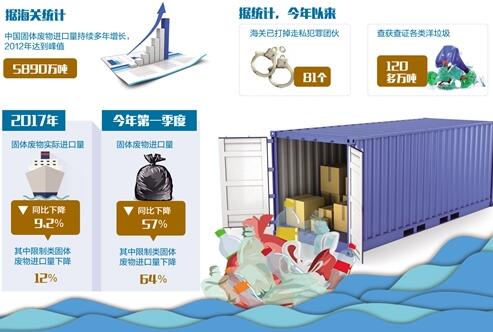在加強(qiáng)監(jiān)管的同時(shí),海關(guān)等部門還加大了對(duì)“洋垃圾”走私的正面攔截。今年5月22日,全國(guó)海關(guān)開展了打擊“洋垃圾”走私“藍(lán)天2018”專項(xiàng)第三輪集中行動(dòng),這是近年來海關(guān)開展的最大規(guī)模打擊“洋垃圾”走私集中行動(dòng)。據(jù)統(tǒng)計(jì),今年以來,海關(guān)已打掉走私犯罪團(tuán)伙81個(gè),查獲查證各類“洋垃圾”120多萬噸。