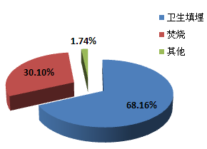 目前,我國城市生活垃圾無害化處理方式包括:衛(wèi)生填埋、高溫堆肥和焚燒,圖1為2014年我國垃圾處理方式比例,顯示我國仍然以填埋為主[2]。但焚燒憑借其減量效果最明顯、無害化最徹底、且焚燒熱量可以有效利用的特點,近年來比例上升很快,可以預(yù)見,焚燒正逐步成為處理城市垃圾的最主要方式。