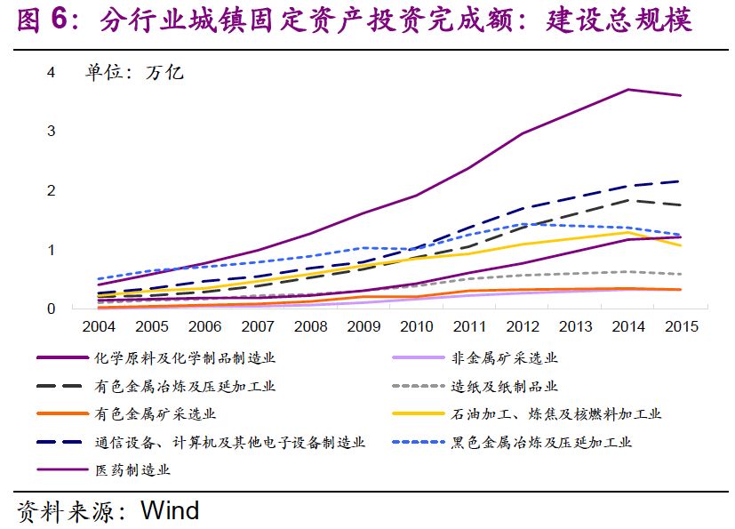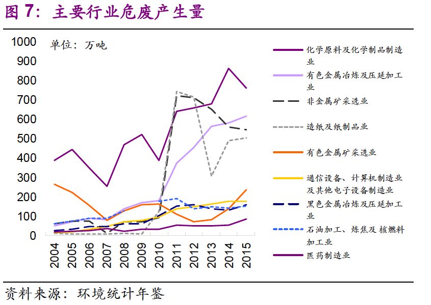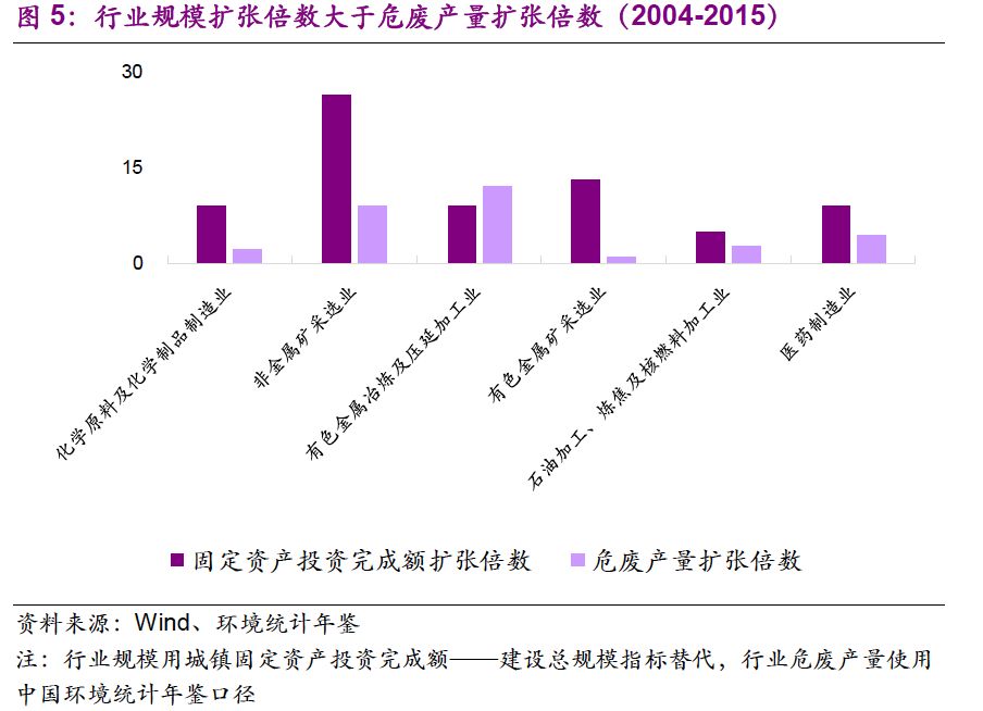 我們也關(guān)注到主要行業(yè)規(guī)模擴張倍數(shù)大于危廢產(chǎn)量擴張倍數(shù)。從2004年到2015年,化學(xué)原料及化學(xué)制品制造業(yè)、非金屬礦采選業(yè)、有色金屬冶煉及壓延加工業(yè)、有色金屬礦采選業(yè)、石油加工、煉焦及核燃料加工業(yè)、醫(yī)藥制造業(yè)的城鎮(zhèn)固定資產(chǎn)投資完成額——建設(shè)總規(guī)模分別是2004年的9 、26 、9 、13 、5 、9 倍,我國工業(yè)體系得到長足發(fā)展。同期,各行業(yè)危廢產(chǎn)量分別是原來的2 、9 、12、1、3 、4 倍,總體小于建設(shè)總規(guī)模擴張倍數(shù)。