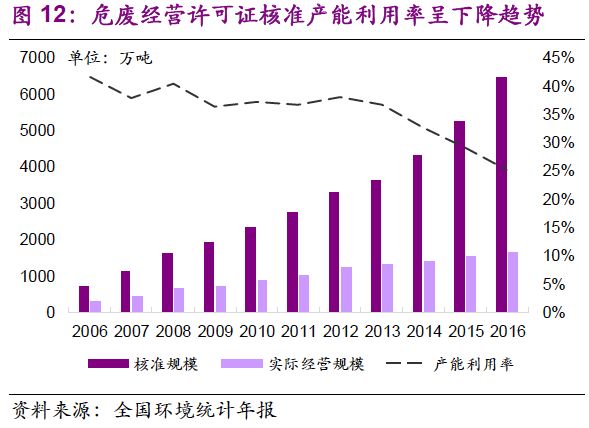 環(huán)保壓力下需求雙層疊加,產(chǎn)能釋放速度有望加快。危廢產(chǎn)業(yè)供需解構(gòu)——需求側(cè):危險廢物處置需求增加的背后,是我國工業(yè)規(guī)模和產(chǎn)品產(chǎn)量的增長。危廢產(chǎn)量與工業(yè)增加值高度相關(guān)(相關(guān)系數(shù)0.91),且具有較強的行業(yè)結(jié)構(gòu)性。同時行業(yè)隱性需求的釋放對環(huán)保壓力較為依賴。供給側(cè):面對需求釋放,危廢許可經(jīng)營發(fā)放規(guī)模表現(xiàn)出較大彈性(2013-2016年CAGR達(dá)21%),但實際經(jīng)營規(guī)模增速有限,由此造成產(chǎn)能利用率進(jìn)一步下降(2013-2016年由37%降至25%)。當(dāng)前,“環(huán)保督察”推動隱性需求釋放、倒逼產(chǎn)業(yè)治理:“歷史存量+當(dāng)期增量”雙層疊加推動“量”的提升,供需不平衡導(dǎo)致區(qū)域“價”的提升,預(yù)計未來2-3年行業(yè)產(chǎn)能釋放速度將加快。