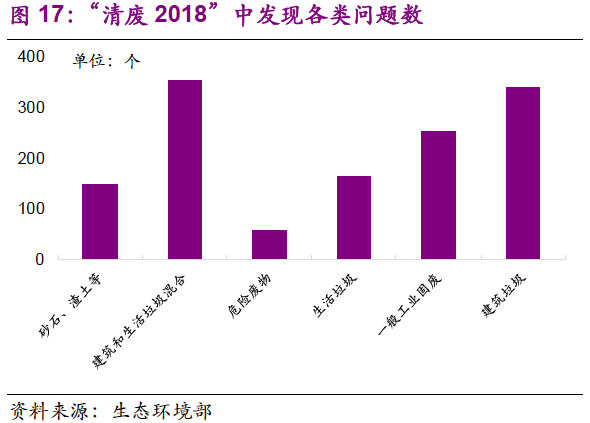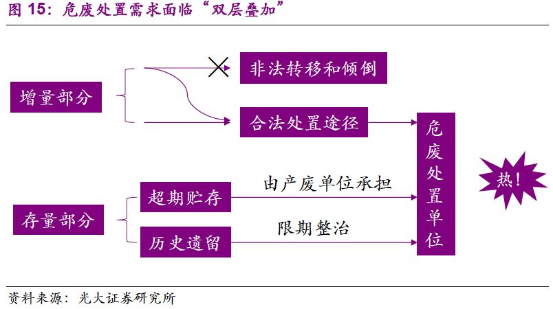 當(dāng)前危廢處置需求“雙層疊加”——歷史存量+當(dāng)期增量。一方面,在制度完善和嚴(yán)督察背景下,每年新增危廢中瞞報、漏報行為減少,非法轉(zhuǎn)移和傾倒途徑被切斷,大量危廢尋找合法處置途徑。另一方面,在環(huán)保督察中大量危廢貯存被發(fā)現(xiàn),短期內(nèi)面臨行政壓力,處置需求十分迫切。存量和增量疊加,危廢處置需求暴增,在供給增加速度不及的情況下,市場熱度持續(xù)提升。