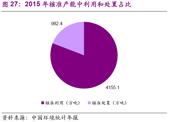 2015年,國家開始推行“三去、一降、一補”,主要行業(yè)固定資產(chǎn)總規(guī)模呈現(xiàn)下降趨勢,這也是供給側(cè)改革背景下的必然趨勢,而這種趨勢預(yù)計至少會延續(xù)到2020年。危廢的產(chǎn)生又與行業(yè)規(guī)模及工業(yè)產(chǎn)品產(chǎn)量有關(guān),因此我們有理由推斷,如果暫不考慮“存量”即隱性需求釋放和統(tǒng)計缺陷,危廢“增量”的實際增速是有限的。