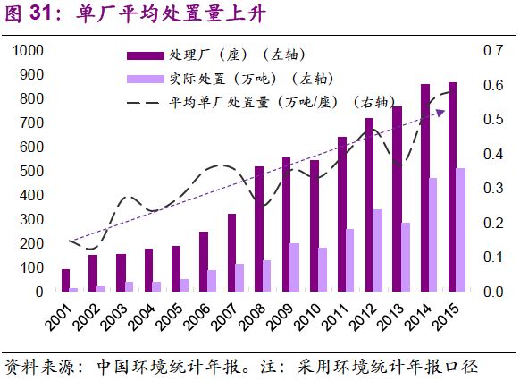 2. 單廠處置量上升,平均規(guī)模由2001年的0.15萬噸/座提升至2015年的0.6萬噸/座。開始階段,危廢處置小型企業(yè)居多,處理方式粗獷、簡單。隨著標(biāo)準(zhǔn)趨嚴(yán),設(shè)備和技術(shù)的提高,單廠處置量大的企業(yè)具備規(guī)模效應(yīng)。當(dāng)前,危廢行業(yè)景氣度的提高,已引起資本市場關(guān)注,如雅居樂、東方園林、中信產(chǎn)業(yè)基金等跨界者強勢進(jìn)入,并通過行業(yè)兼并等方式逐漸規(guī)?;?/p>
