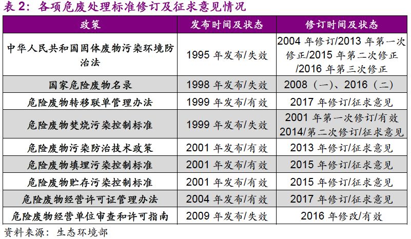 1995年《固廢法》的出臺,標(biāo)志著我國危廢行業(yè)的起步?!豆腆w廢物污染環(huán)境防治法》首次從法律層面涉及危廢管理,同時提及經(jīng)營許可證、危險廢物轉(zhuǎn)移聯(lián)單、國家危險廢物名錄,而三者落地的時間分別為2004、1999和1998年。從1995-2002年,我國基本建立起危廢處理處置從鑒別-處理-排放的標(biāo)準(zhǔn)體系。