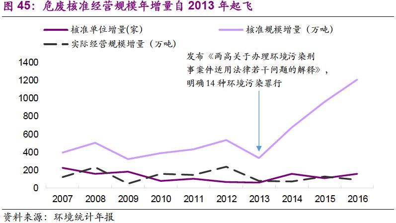 2013年,危廢入刑推動行業(yè)進(jìn)入全新階段。2013年6月,最高人民法院、最高人民檢察院通過《關(guān)于辦理環(huán)境污染刑事案件適用法律若干問題的解釋》,規(guī)定非法排放、傾倒、處置危險廢物三噸以上的,應(yīng)當(dāng)認(rèn)定為“嚴(yán)重污染環(huán)境”。危廢入刑直接推動危廢行業(yè)進(jìn)入全新階段,年核準(zhǔn)規(guī)模增量一躍而起,并逐年創(chuàng)新高。