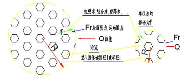 物料內(nèi)部水份必須通過熱能形成具有一定壓力的蒸汽克服遷移路徑(R)的阻力(f)才能排出顆粒表面以外,熱能(Q)是通過物料之間的傳導(dǎo),其需要傳遞的時(shí)間和過剩能量, 有一個(gè)重要的因素就是其傳導(dǎo)路徑(R)的長短;
