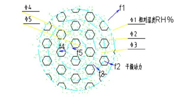 干燥動力(f1~f5):就是物料中水份(或溶液)向物料外部的遷移(蒸發(fā))的能力。其處決于物料與相鄰物體的蒸汽分壓或相對濕度(RH)的差值,差值越大,其移動或轉(zhuǎn)移的能力就越大。物體內(nèi)階梯型的相對濕度(φ1~φ5)逐漸增加,在φ1很小φ5很大時(shí),階梯的相對濕度(RH)的差值更趨明顯,水分遷移能力就很大。而當(dāng)φ1接近φ5時(shí), 階梯的相對濕度(RH)的差值減少,水分遷移能力(蒸發(fā)強(qiáng)度)就很小。這就是同等條件下,干燥設(shè)備內(nèi)物料水分較小時(shí),蒸發(fā)強(qiáng)度低的原因。
