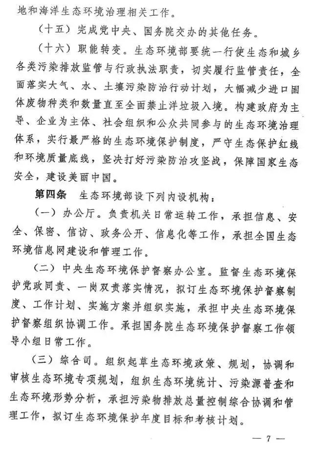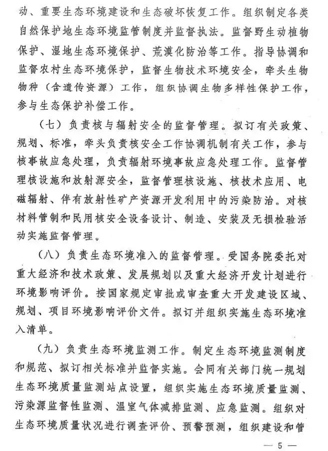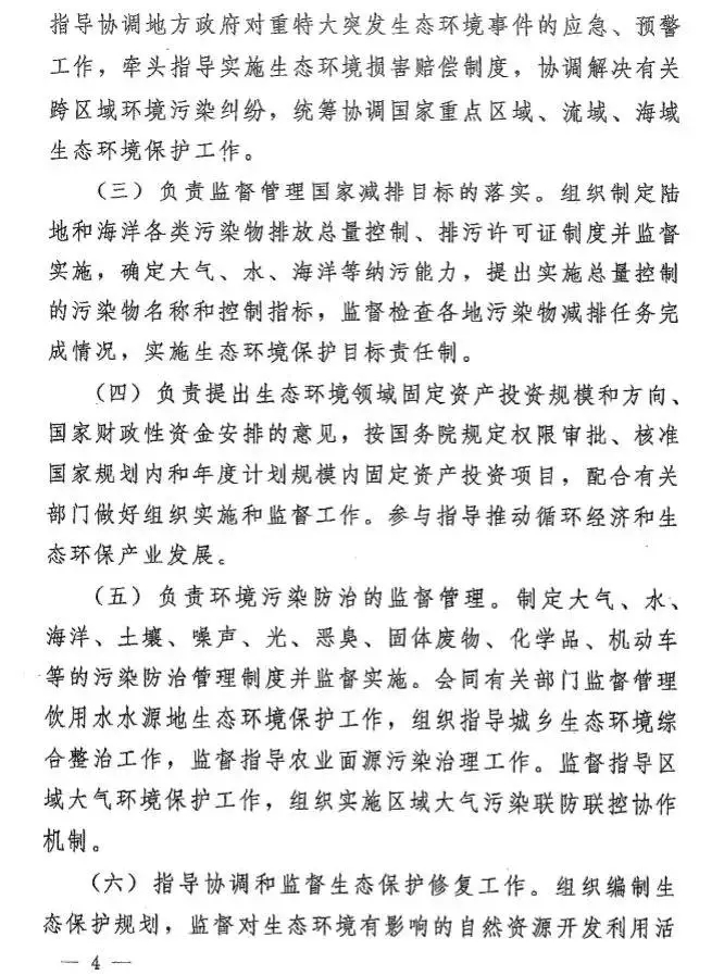 根據(jù)今年國務(wù)院機構(gòu)改革方案,生態(tài)環(huán)境部負責(zé)建立健全生態(tài)環(huán)境基本制度,負責(zé)重大生態(tài)環(huán)境問題的統(tǒng)籌協(xié)調(diào)和監(jiān)督管理,負責(zé)提出生態(tài)環(huán)境領(lǐng)域固定資產(chǎn)投資規(guī)模和方向、國家財政性資金安排的意見,以及負責(zé)環(huán)境污染防治的監(jiān)督管理、生態(tài)環(huán)境準入的監(jiān)督管理、生態(tài)環(huán)境監(jiān)測、生態(tài)環(huán)境監(jiān)督執(zhí)法等。
