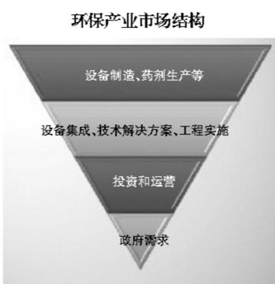 第一,以政府需求為主的市場(chǎng)結(jié)構(gòu)呈現(xiàn)倒三角形。倒三角形最上層是數(shù)量眾多且以民營(yíng)企業(yè)為主的設(shè)備制造、藥劑生產(chǎn)等上游環(huán)節(jié);中間層是數(shù)量中等,也以民營(yíng)企業(yè)為主的設(shè)備集成、技術(shù)解決方案、工程實(shí)施等中游環(huán)節(jié);最底層是數(shù)量最少以國有企業(yè)為主、從事投資和運(yùn)營(yíng)業(yè)務(wù)的下游環(huán)節(jié)。這一倒三角市場(chǎng)結(jié)構(gòu)的支點(diǎn)是政府環(huán)境治理需求,這樣的市場(chǎng)結(jié)構(gòu)往往經(jīng)不起“風(fēng)吹草動(dòng)”。只有政府需求端變寬一點(diǎn),比如出現(xiàn)深度處理需求,才能促使企業(yè)形成差異化格局,衍生出不同發(fā)展路徑。