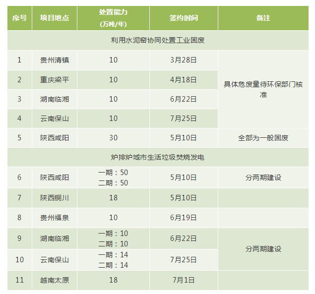 2018年二季度以來,公司新增簽約11個環(huán)保項目,其中利用水泥窯協(xié)同處置工業(yè)固廢危廢項目5個、爐排爐垃圾焚燒發(fā)電項目6個,新增處理生活垃圾194萬噸/年、處置固廢危廢70萬噸/年的產(chǎn)能規(guī)模。