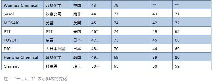 中國企業(yè)方面,除了中石化和臺塑以外,又有一家實力雄厚企業(yè)進入榜單-萬華化學,另外先正達已被中國化工收購,中國上榜企業(yè)達到4家和韓國齊平。