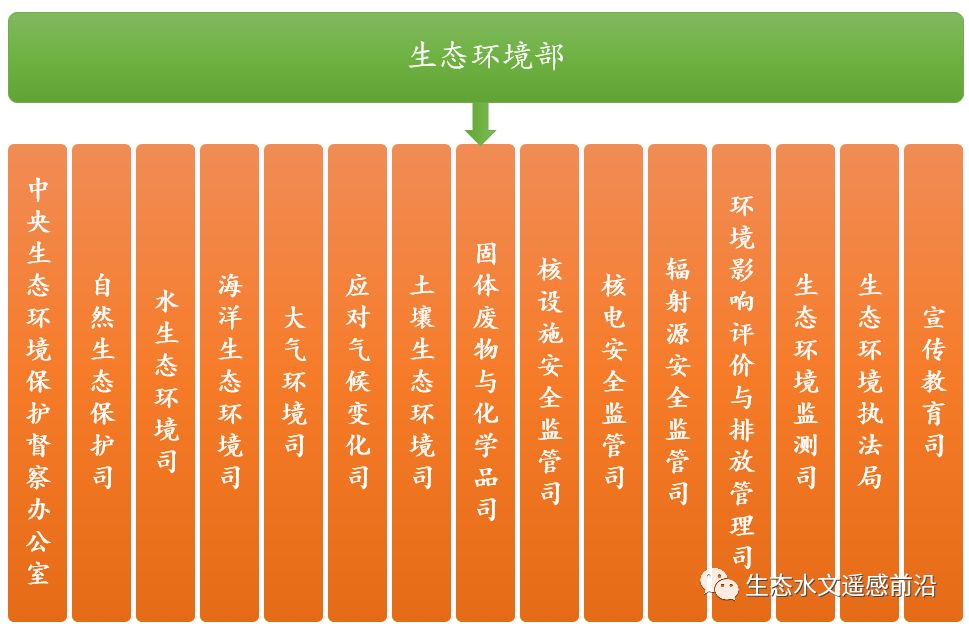生態(tài)環(huán)境部、自然資源部、國家林業(yè)和草原局、水利部除設(shè)置辦公廳、綜合司、法規(guī)司、人事司、財務(wù)司、國際合作司、機關(guān)黨委和離退休干部辦公室等司局外,生態(tài)環(huán)境部還下設(shè)中央生態(tài)環(huán)境保護督察辦公室、自然生態(tài)保護司(生物多樣性保護辦公室、國家生物安全管理辦公室)、水生態(tài)環(huán)境司、海洋生態(tài)環(huán)境司、大氣環(huán)境司(京津冀及周邊地區(qū)大氣環(huán)境管理局)、應(yīng)對氣候變化司、土壤生態(tài)環(huán)境司、固體廢物與化學品司、核設(shè)施安全監(jiān)管司、核電安全監(jiān)管司、輻射源安全監(jiān)管司、環(huán)境影響評價與排放管理司、生態(tài)環(huán)境監(jiān)測司、生態(tài)環(huán)境執(zhí)法局、宣傳教育司等機構(gòu)。