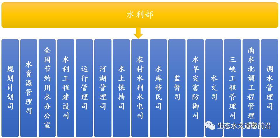 水利部下設(shè)規(guī)劃計劃司、水資源管理司、全國節(jié)約用水辦公室、水利工程建設(shè)司、運行管理司、河湖管理司、水土保持司、農(nóng)村水利水電司、水庫移民司、監(jiān)督司、水旱災(zāi)害防御司、水文司、三峽工程管理司、南水北調(diào)工程管理司、調(diào)水管理司等機構(gòu)。